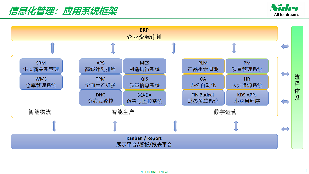 NIDEC Revator Motors ມີລະບົບທີ່ພັດທະນາຢ່າງເປັນລະບົບເອກະລາດເຊັ່ນ SRM (ການຈັດການດ້ານການພົວພັນກັບຜູ້ສະຫນອງ (ການວາງແຜນຂັ້ນສູງແລະກໍານົດລະບົບ (ລະບົບການຄຸ້ມຄອງສາງ), ແລະ TPM ທັງຫມົດ). ມັນສ້າງລະບົບການຜະລິດທີ່ສະຫຼາດທັງຫມົດໂດຍຜ່ານການອັດຕະໂນມັດ, ແບບຈໍາລອງ, ການເບິ່ງເຫັນ, ການສ້າງພື້ນຖານທີ່ແຂງແຮງສໍາລັບການຮັບຮູ້ຂອງ "ໂຮງງານໄຟຟ້າ".